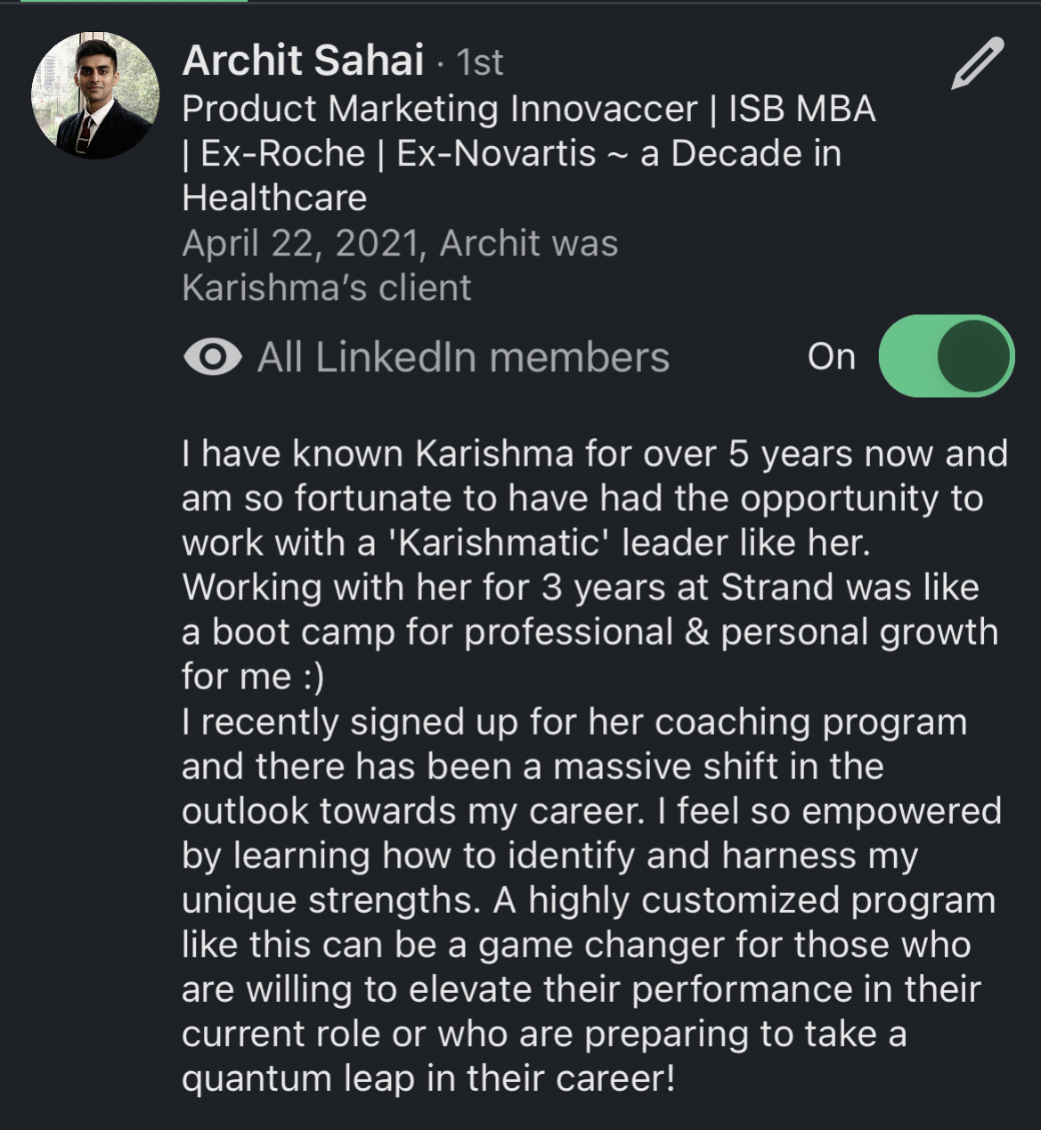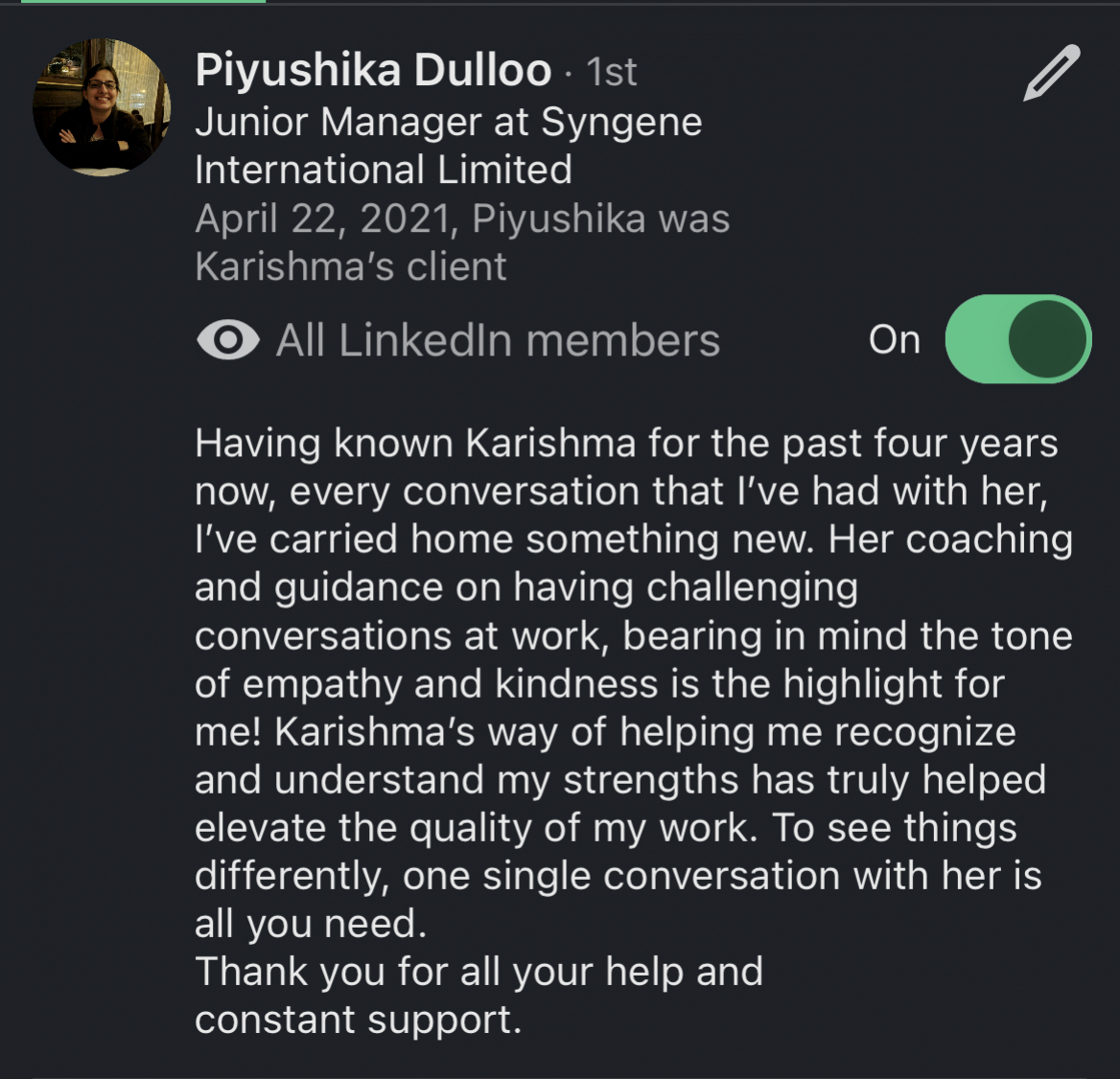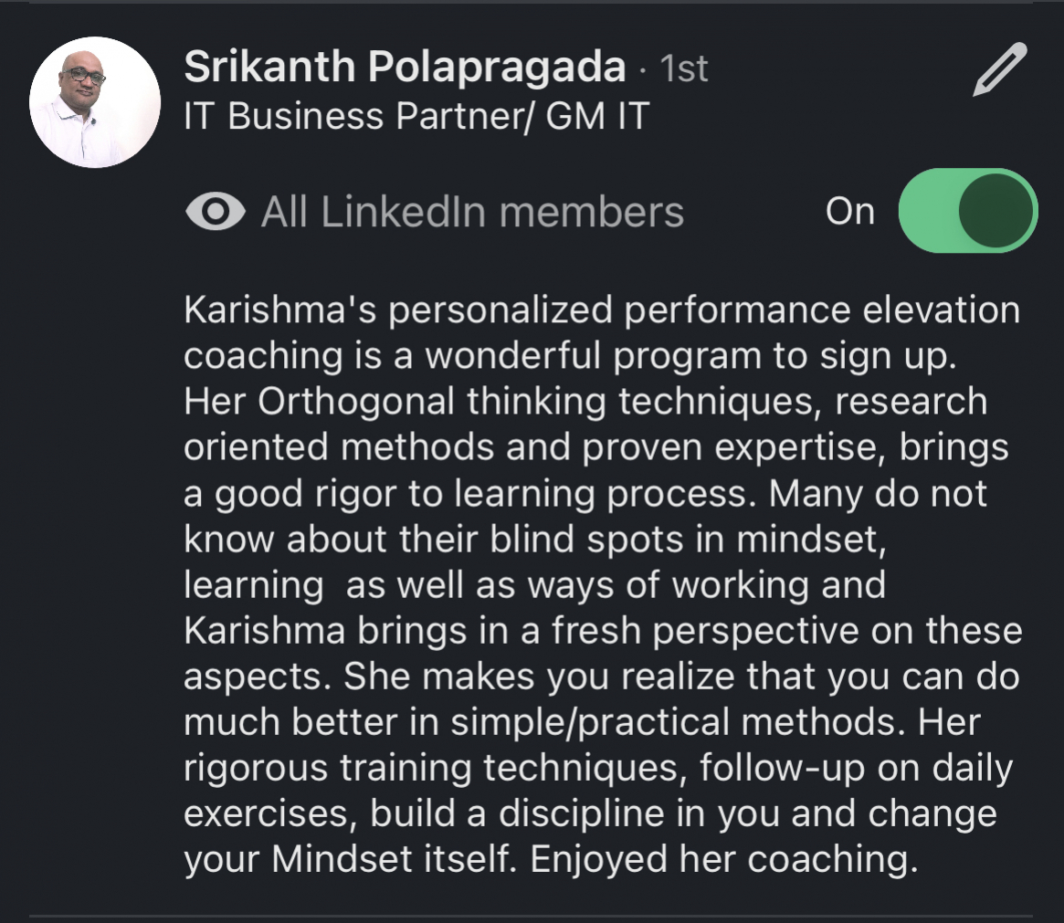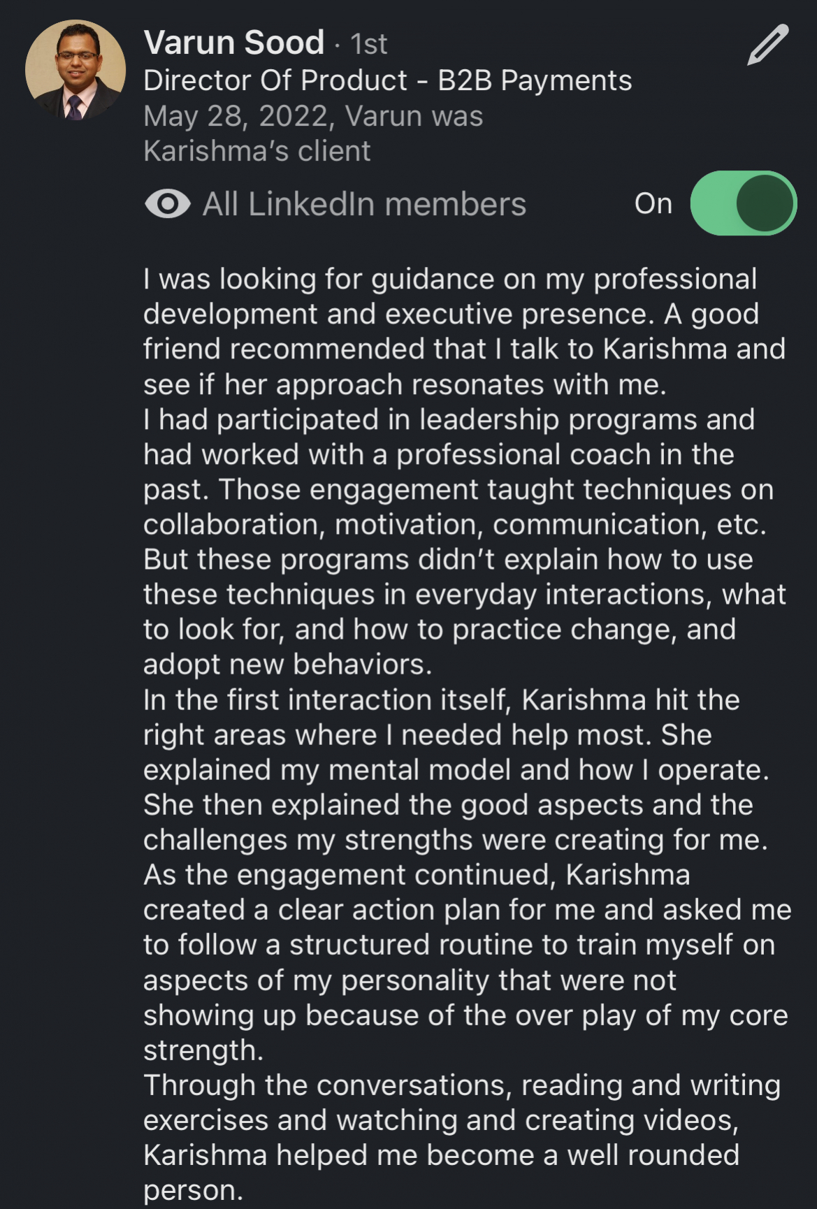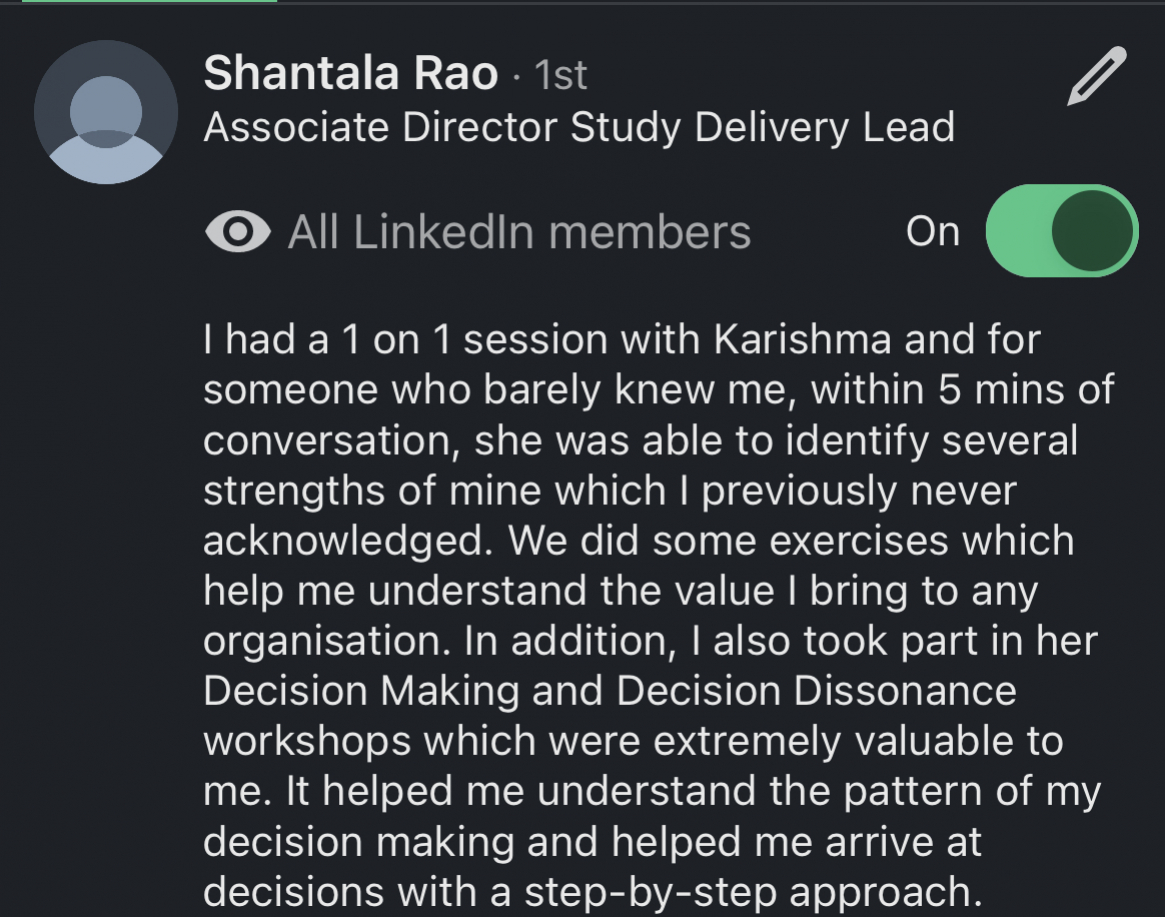 Hi, I'm Karishma! I have two decades of corporate experience having worked in both US and India for a decade each. In 15 years of people management, I’ve often been complimented for my depth of understanding people behaviour and my analytical bent of mind.